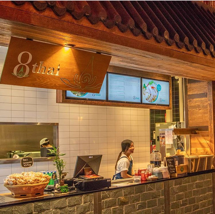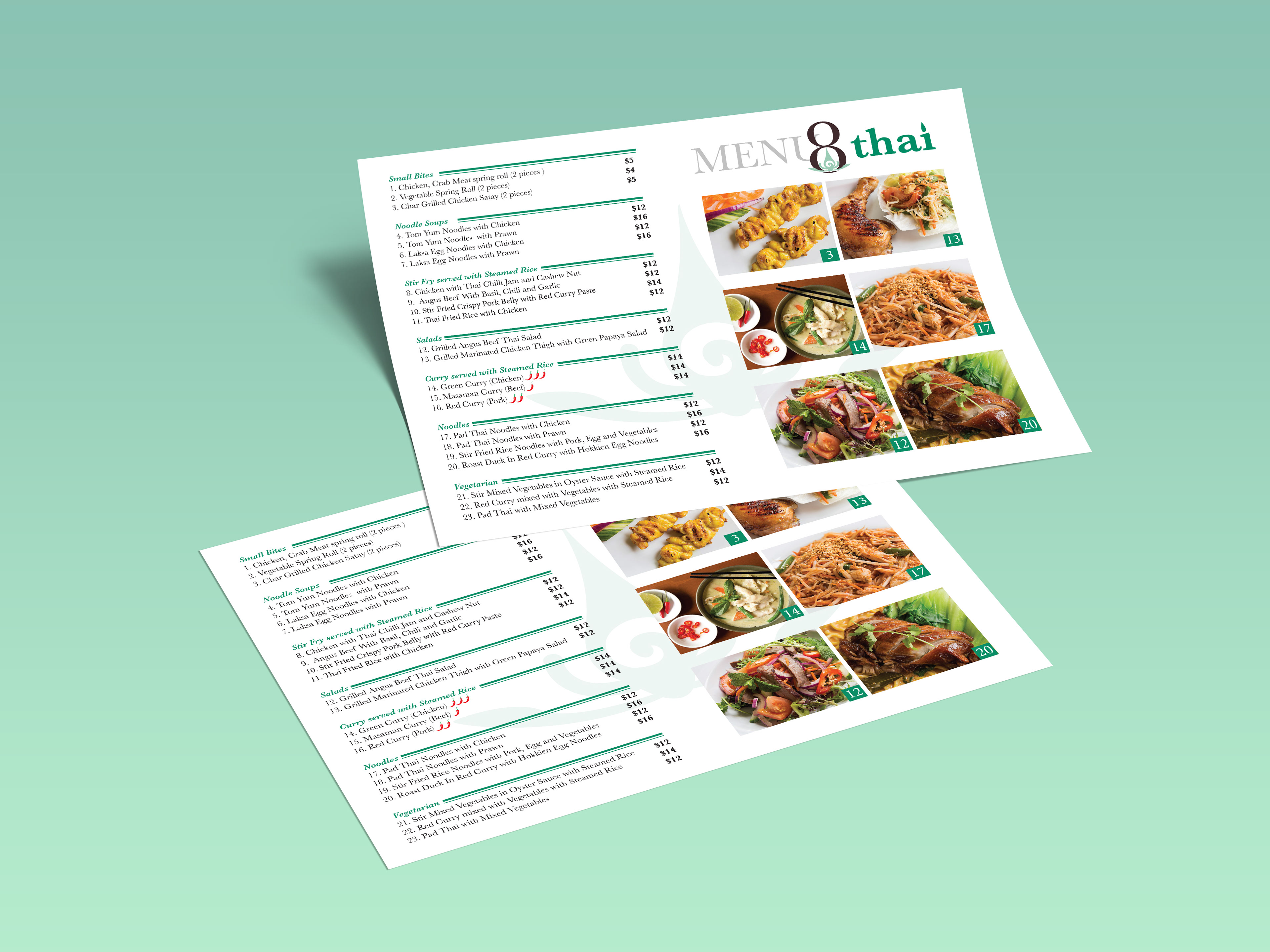 8 Thai logo design for a pop-up Thai restaurant situated in Brisbane's '8 Street' precinct. Project included logo design, shop signage, printed and digital menu design, and screen imagery for the products.