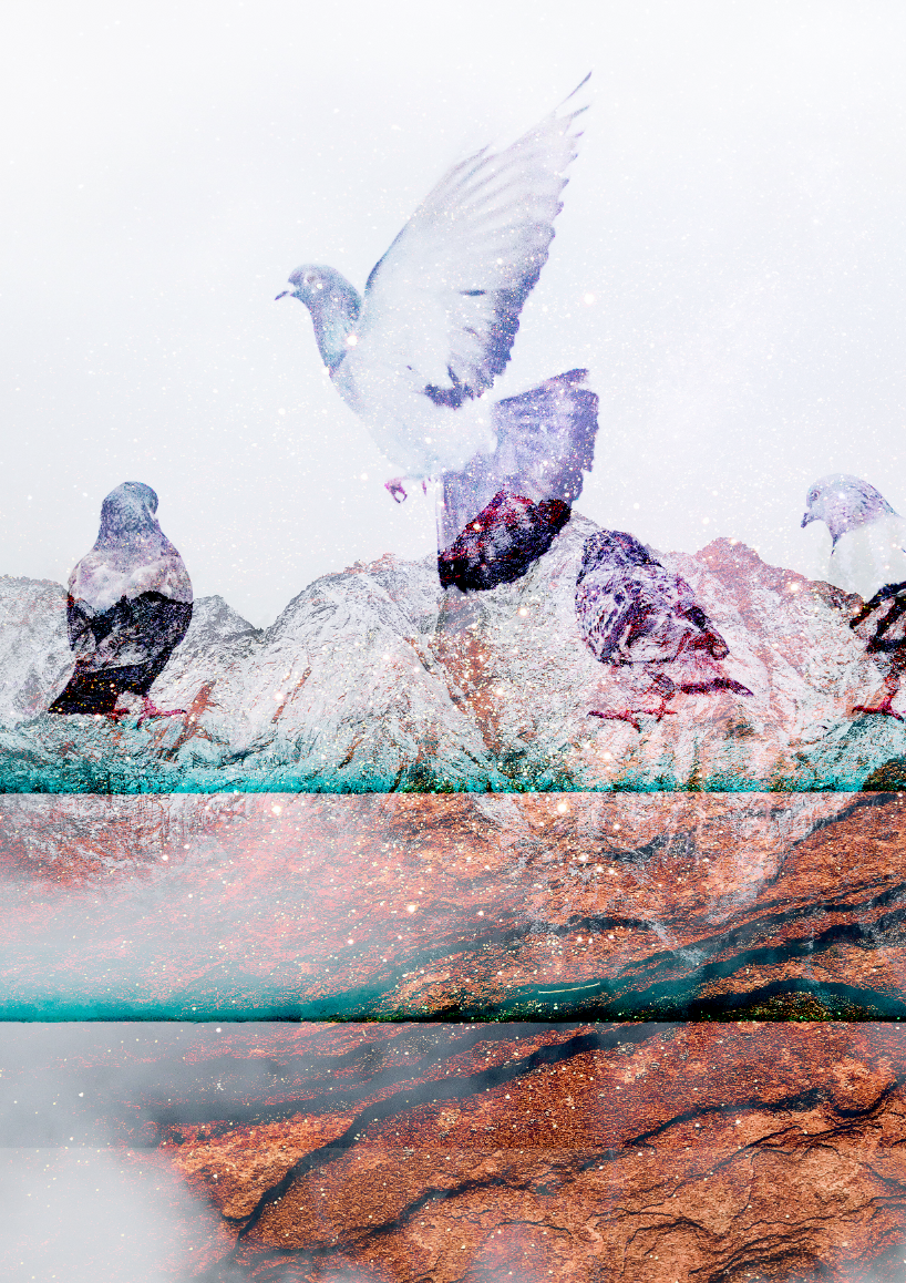 Digital collage (montage) created in Adobe Photoshop. Using blending modes, layer masks and clipping masks. I regularly teach these techniques in the Diploma of Graphic Design and local community workshops.