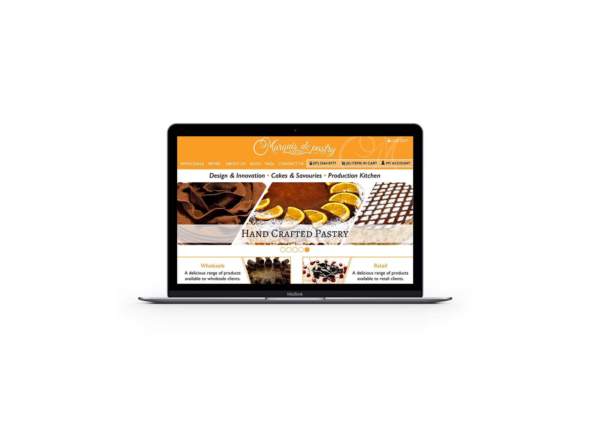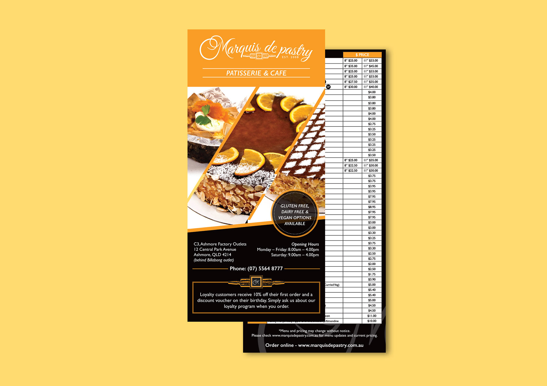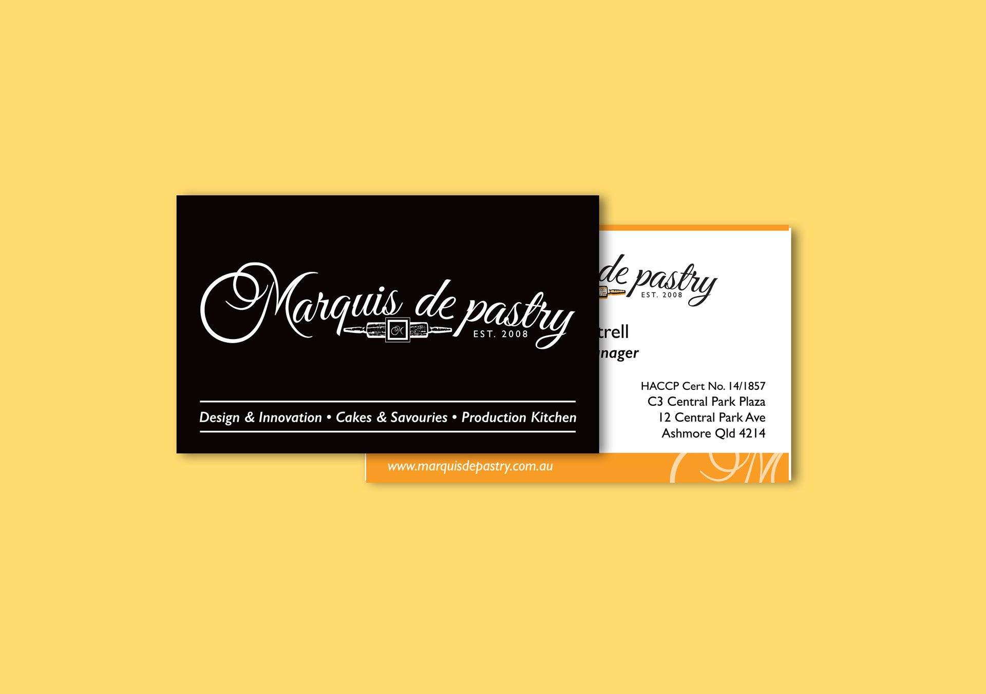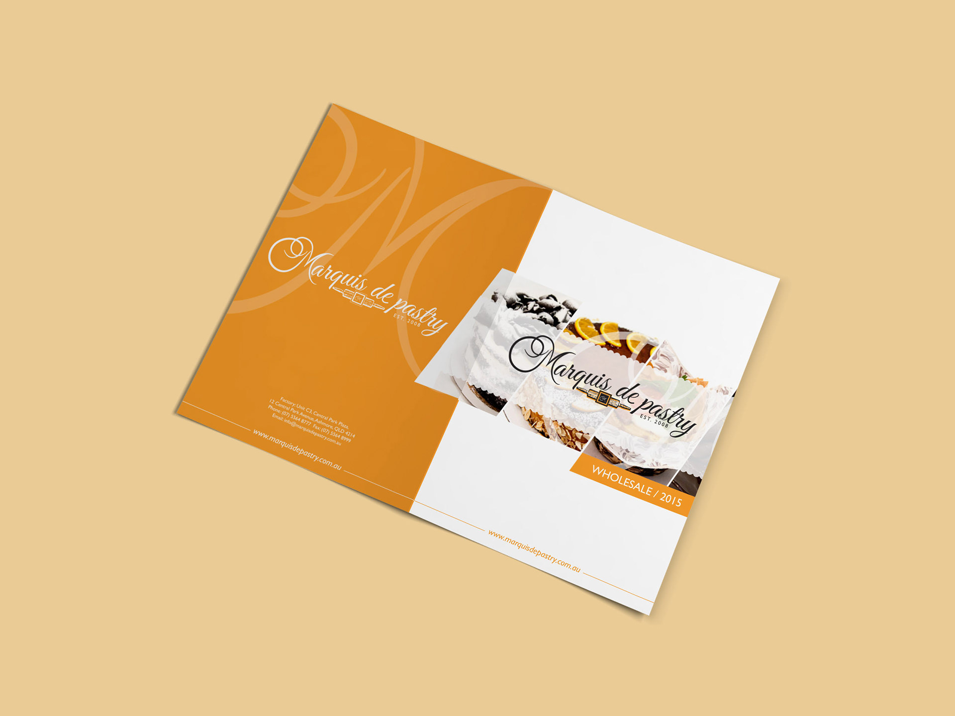 Marquis de Pastry Rebrand, based on the Gold Coast, Australia. Rebrand included logo, business cards, package design, wholesale & retail brochures, website interface, DL flyers, shopfront signage and stickers.